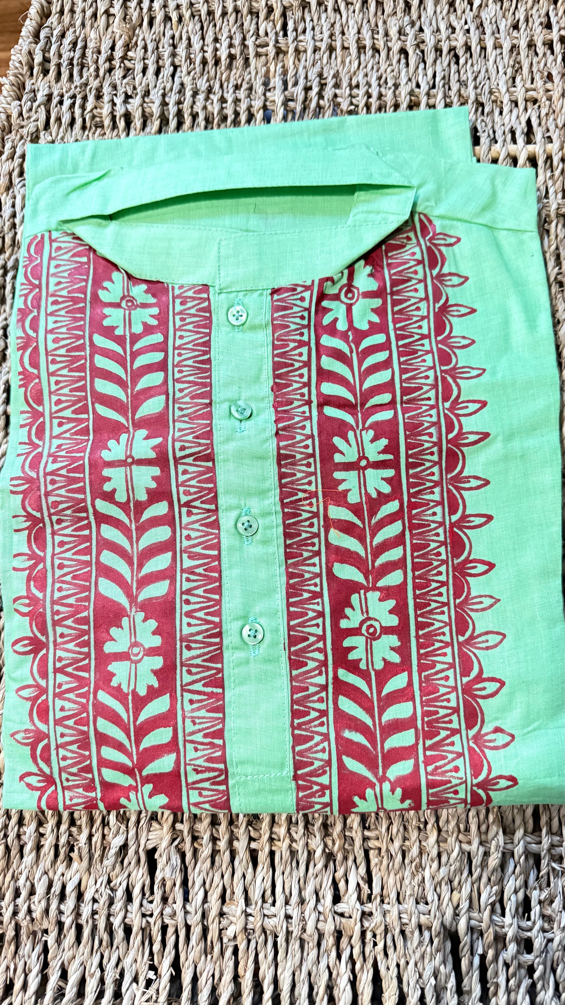 The Madhubani cotton kurta features intricately hand-painted designs, reflecting traditional artistry. Crafted from 100% cotton, it offers breathability and comfort, making it suitable for various occasions. The unique Madhubani patterns not only enhance aesthetic appeal but also support sustainable fashion practices.