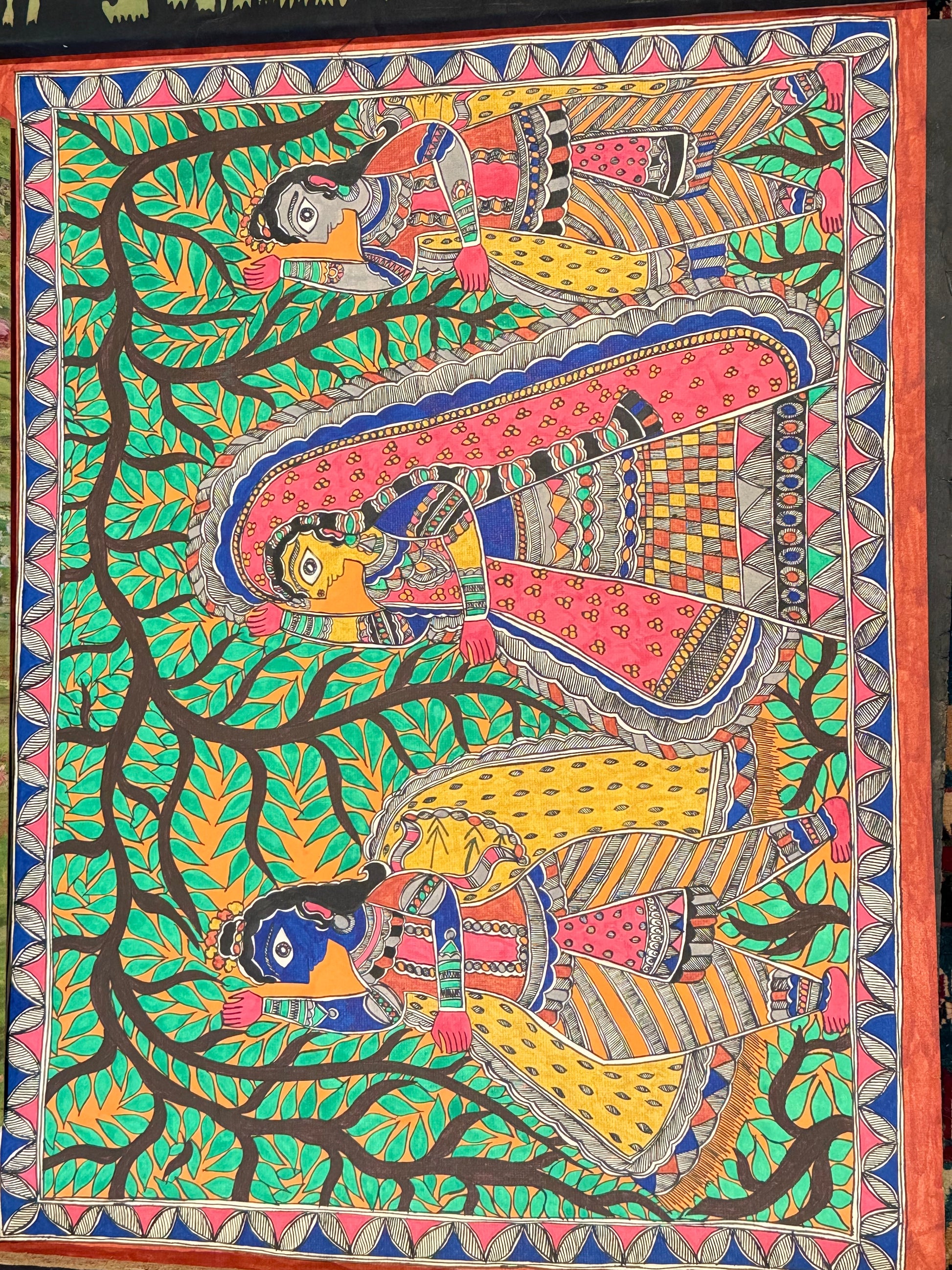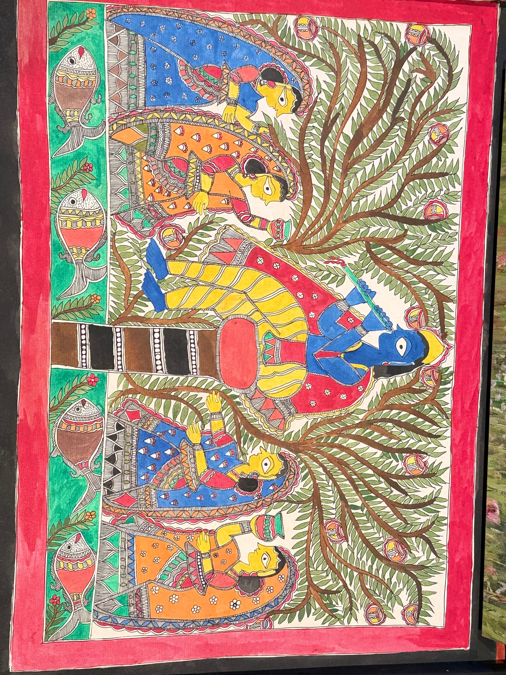 Mithila painting, also known as Madhubani art, is an ancient Indian art form originating from the Mithila region of Bihar. Traditionally created by women, these paintings feature intricate patterns, symbolic imagery, and stories from Hindu epics.